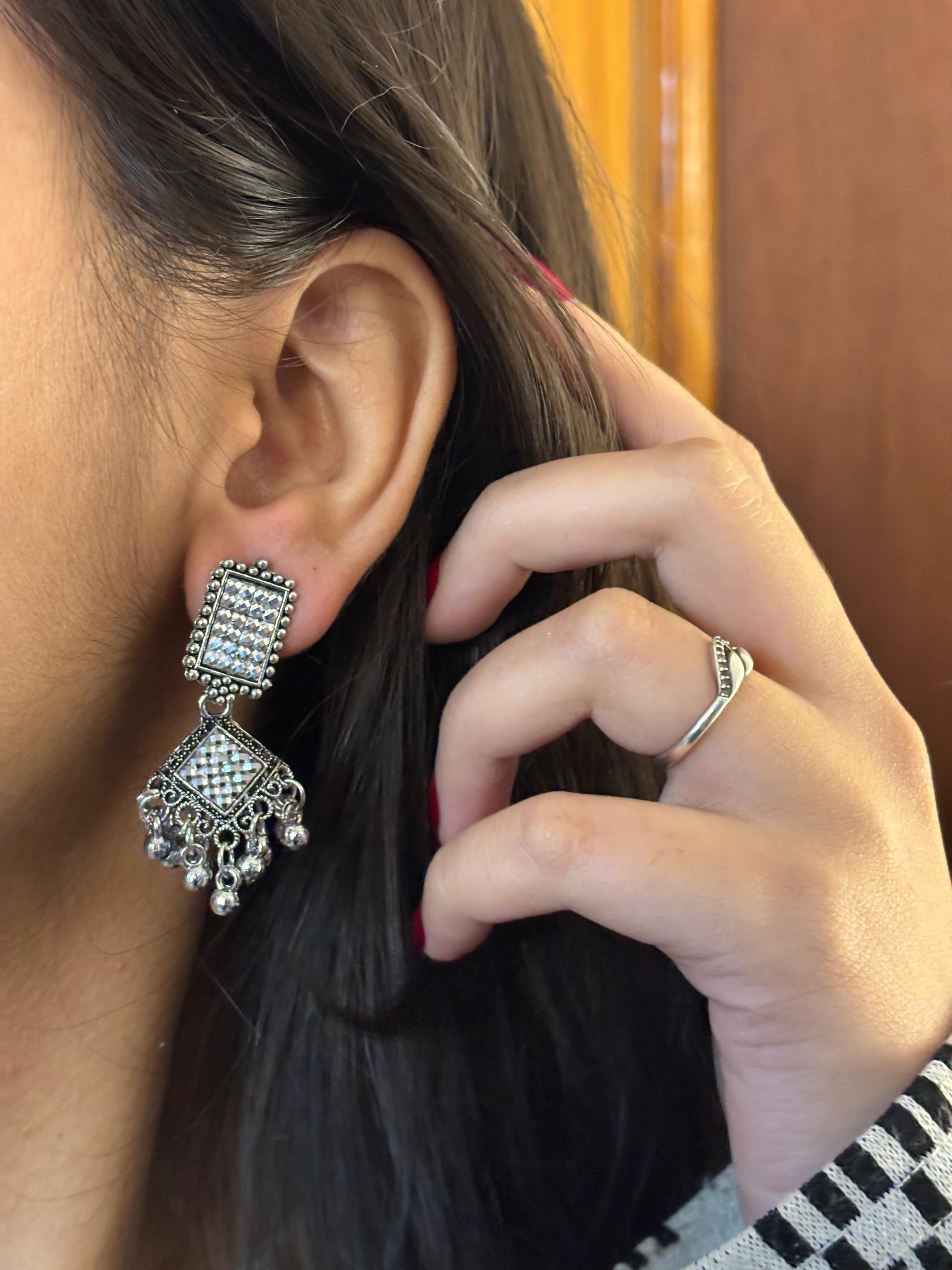- Oxidised square jhumka earrings โ Square oxidised stud with layered dangling bead elements.