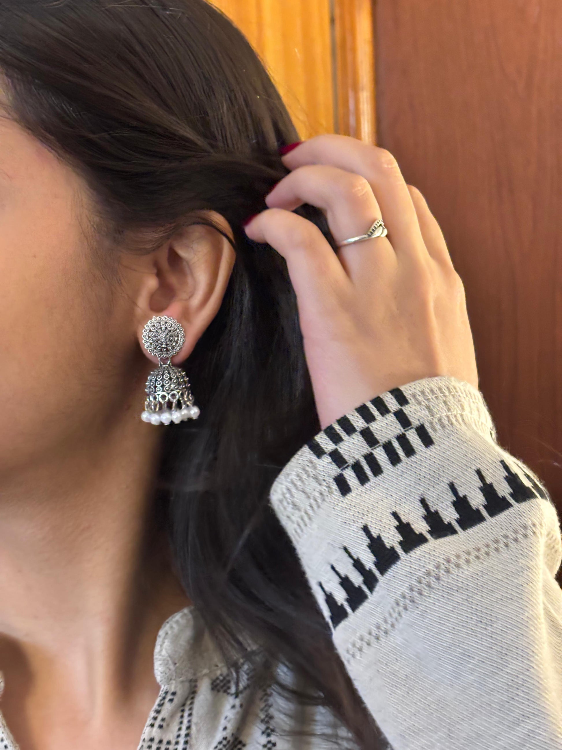 - Silver round kundan jhumka earrings โ Circular stud with intricate dome jhumka and pearl drop detailing.