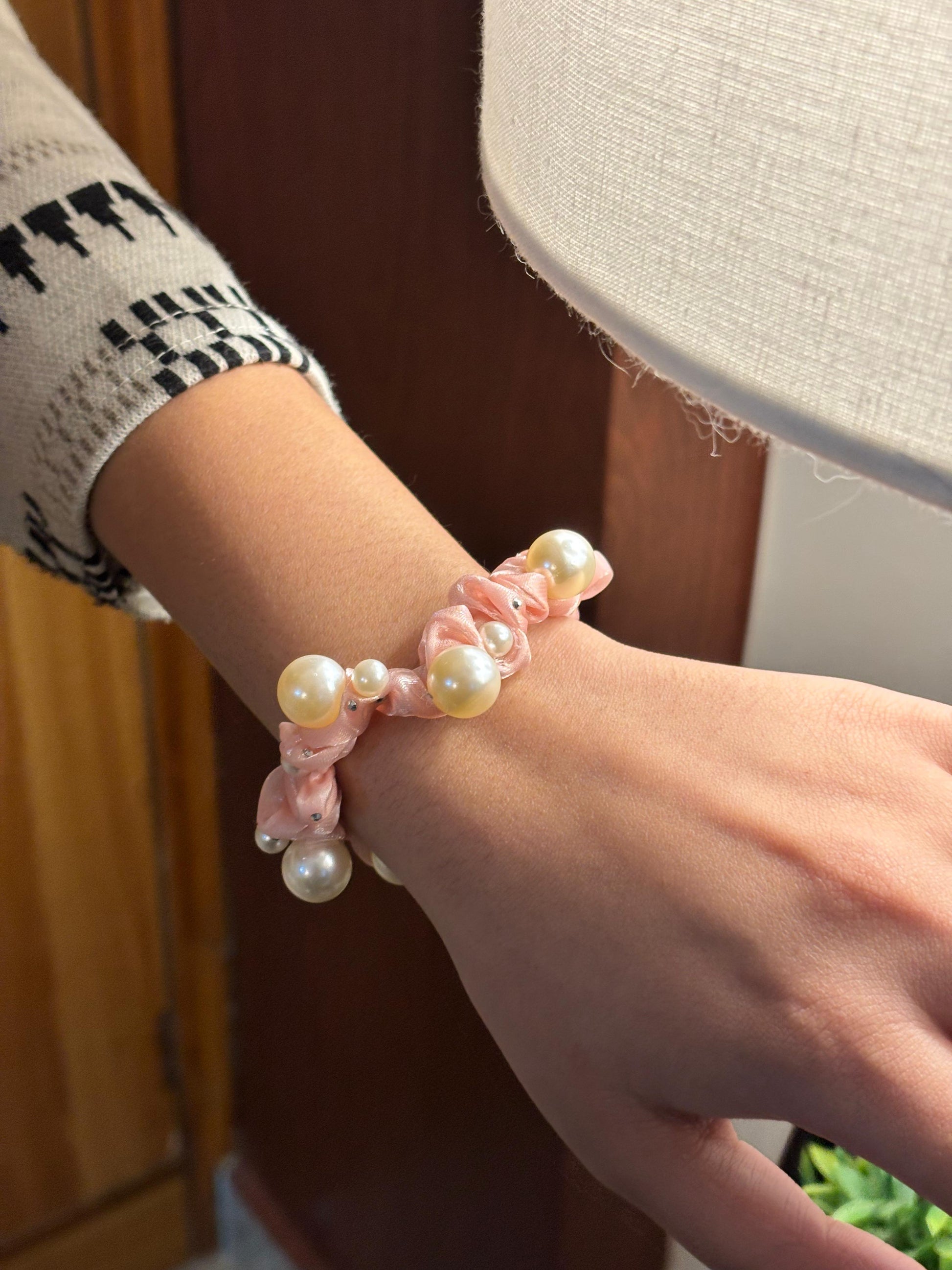 - Pink pearl bead bracelet โ Elastic bracelet featuring glossy pink/peach-toned pearl-style beads