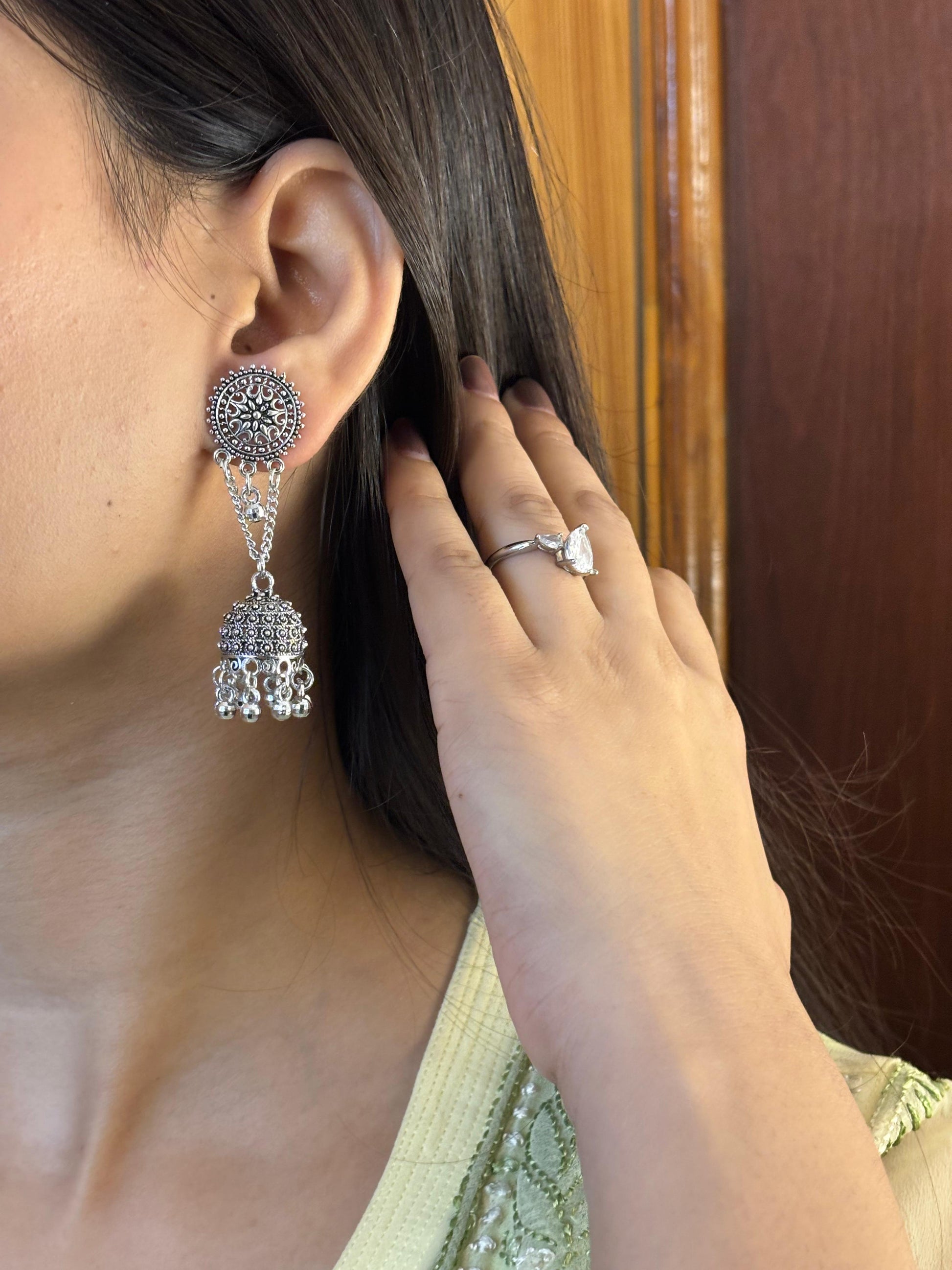 - Oxidised floral jhumka earrings โ Flower-shaped stone stud with dome jhumka detailing.